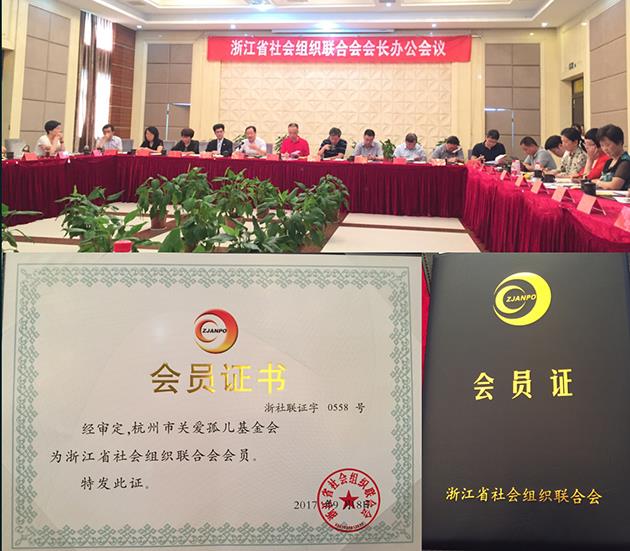 2017年9月18日,浙江省社会组织联合会会长办公会议在三门蛇蟠岛召开,会议通过了杭州市关爱孤儿基金会的入会申请,杭州市关爱孤儿基金会正式成为社会组织联合会的一员。