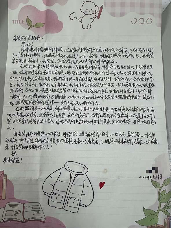 “在这寒冷的日子里收到您的棉服,就如同收到一个美好的拥抱……我坚信,这份温情足以抵御世间所有寒凉。”