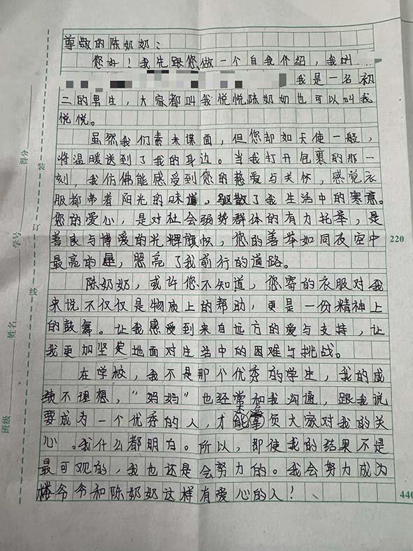 “孩子们太不容易了。我只是为他们做了一点点微不足道的事情。”收到转交的这些来信后,陈奶奶既惊喜,又感动。这些手写书信用一种质朴而深刻的情感表达方式,让她的爱心得到了念念不忘的回响。