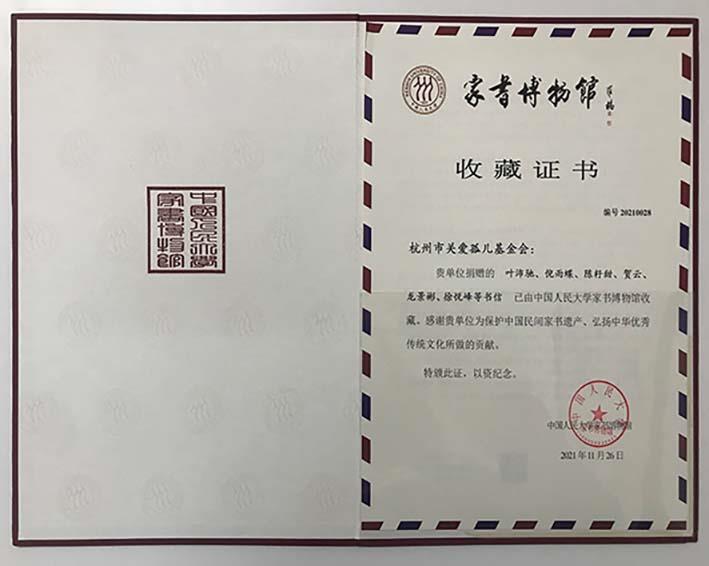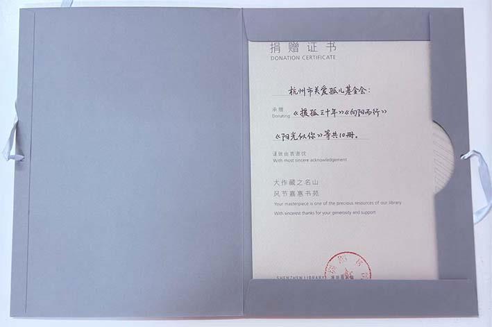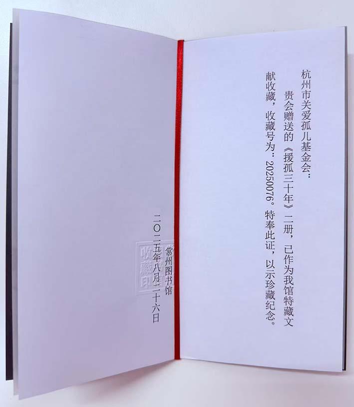 由杭州市关爱孤儿基金会编撰、文汇出版社出版的《援孤三十年》及本会受助孤儿作文集《阳光似你》《向阳而行》,近期先后被中国人民大学家书博物馆、杭州市图书馆、杭州市档案馆、深圳图书馆、常州图书馆等正式收藏。